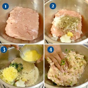 Combine ground chicken with egg and Parmesan cheese, shape, and cook until golden.