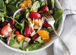 Create a strawberry mandarin orange spinach salad by tossing spinach leaves with strawberries, mandarins, and a sweet vinaigrette.